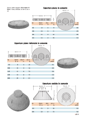 Coperture prodotte impiegando calcestruzzo vi- Coperture piane in cemento brato e armato, confezionato con inerti di cava la- diametro - Ø vati. diametro - Ø 10 tipo diametro altezza peso ca. cod 51 Ø cm cm kg prodotto 22 22 80 80 10 90 1460 100 100 10 171 1470 125 125 10 268 1490 150 150 10 440 1510 Coperture piane rinforzate in cemento diametro - Ø diametro - Ø H 22 22 51 tipo diametro altezza H peso ca. cod Ø cm cm kg prodotto 80 80 18 220 1461 100 100 18 356 1480 125 125 20 576 1500 150 150 20 737 1520 200 200 20 1355 1550 Coperture coniche in cemento diametro - Ø diametro - Ø ispezione Ø 25 6 H 10 63 tipo diametro altezza peso ca. cod Ø cm cm kg prodotto 150 150 50 500 1530 200 200 60 770 1560 21