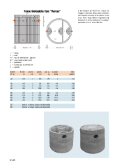 Fosse biologiche tipo “Varese” Le fosse biologiche tipo “Varese” sono realizzate con D l’impiego di calcestruzzo vibrato, armato conveniente- mente composto da cemento ad alta resistenza e inerti di cava lavati. I disegni indicano la disposizione degli 1 B A2 B C B 2 50 elementi; per un corretto funzionamento si sconsiglia il superamento di 2 m in altezza della fossa. 1 B A2 B C B 2 A1 A1 s diametro - Ø s s diametro Ø s 1 = entrata 2 = uscita A1 = vasca di sedimentazione e digestione A2 = zona accumulo sostanze grasse B = paraschiuma C = seconda vasca di sedimentazione D = coperchio diametro H totale spessore capacità peso ca. n. persone codice Ø cm cm s cm litri kg servite prodotto 60 100 5 380 340 2 1150 80 100 5 502 470 3/4 1160 80 150 5 750 552 4/5 1170 80 200 5 1’000 713 5/6 1180 100 100 6 785 630 5/6 1190 100 150 6 1’170 860 8/10 1200 100 200 6 1’540 1’100 12/15 1210 100 250 6 1’950 1’270 22/23 1220 150 fornitura su richiesta: chiedere sulla disponibilità 200 fornitura su richiesta: chiedere sulla disponibilità 24