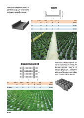 Prodotti impiegando calcestruzzo gettato e ar- Vialetti mato, confezionato con inerti di cava lavati, sono la soluzione 8 ideale per la creazione di passaggi pedonali e accessi nei giardini, negli orti e negli impianti di florovivaismo. 25 L tipo lunghezza larghezza altezza peso ca. codice cm cm cm kg prodotto 60 100 60 25 97 VIA 200 80 100 80 25 127 VIA 250 Prodotti impiegando calcestruzzo gettato confe- Grigliati Elementi BG zionato con inerti di cava lavati, sono la soluzione ideale per la creazione di pavimentazioni robuste in grado di sop- portare anche il traffico pesante in parcheggi, viali di ac- cesso, percorsi ripidi e anche per il consolidamento di scarpate franose. Il grigliato BG si posa accostando gli ele- 40 menti uno all’altro; a posa ultimata si riempie con terriccio vegetale e si procede alla semina del manto erboso. 60 tipo lunghezza larghezza altezza peso ca. resa codice cm cm cm kg pezzi/m 2 prodotto Grigliato 60 40 12 35 4,2 QUA 600 36
