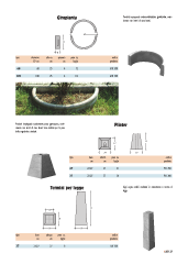Giropianta Prodotti impiegando calcestruzzo gettato, confe- zionato con inerti di cava lavati. Ø H B tipo diametro altezza spessore peso ca. codice Ø cm cm cm kg/pz prodotto 60 60 25 4 72 GIR 200 100 100 25 4 112 GIR 300 Prodotti impiegando calcestruzzo gettato, confe- Plinter zionato con inerti di cava lavati. Sono indicati per la posa della segnaletica stradale. H 27 5 27 27 tipo base altezza peso ca. codice cm cm kg/pz prodotto 27 27x27 27 21 PLI 250 37 27x27 37 30 PLI 200 Termini per legge Cippi segna confini realizzati in calcestruzzo a norma di legge. H 10 14 14 14 tipo base altezza peso ca. codice cm cm kg/pz prodotto 27 27x27 27 8 TER 200 37